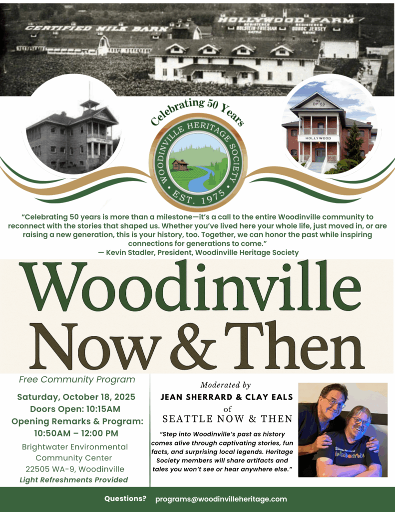Founded in 1975, the Woodinville Heritage Society is a nonprofit organization dedicated to preserving and sharing the rich history of the greater Woodinville area. Our mission is to collect, protect, and celebrate the artifacts and stories that define our community—ensuring that Woodinville’s past continues to inspire residents for generations to come.